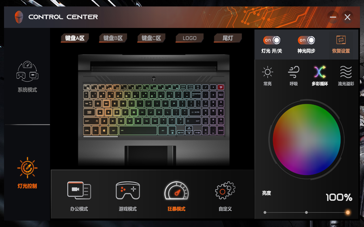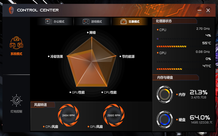 CONTROL CENTER是系统里标配的控制软件,玩家可以利用它对电脑的运行模式、键盘灯效、RGB氛围灯效进行设置,打造自己理想的电脑运行效果。