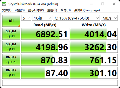 通过CrystalDiskMark这款测试软件的成绩来看,这款SSD的性能非常不错,顺序读取速度超过6800MB/s,顺序写入速度超过4000MB/s,属于一款比较高端的PCIe 4.0固态硬盘。