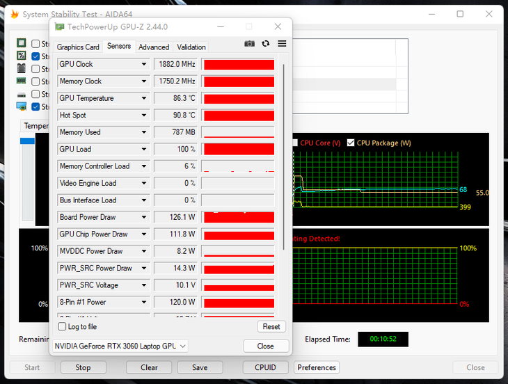 开启双烤机10分钟之后,这款游戏本的CPU+GPU的功率输出总和达到了181W。此时,这款笔记本的CPU温度稳定在了68℃左右,此时功耗约为55W。GPU温度稳定在了约86℃左右,此时功耗约为126W。