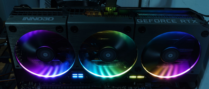 三个10cm直径的超大型风扇构建成3090TI的风动力主体,镰刀型扇叶可以带来更大的入风量。