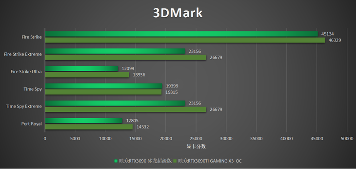 在3DMARK基准测试中,映众INNO3D GEFOFCE RTX 3090 Ti Gaming X3 OC版相比RTX 3090 均有不错的性能提升,幅度达到了10%以上,与RTX3090已拉开了一个段位,堪称桌面最强。