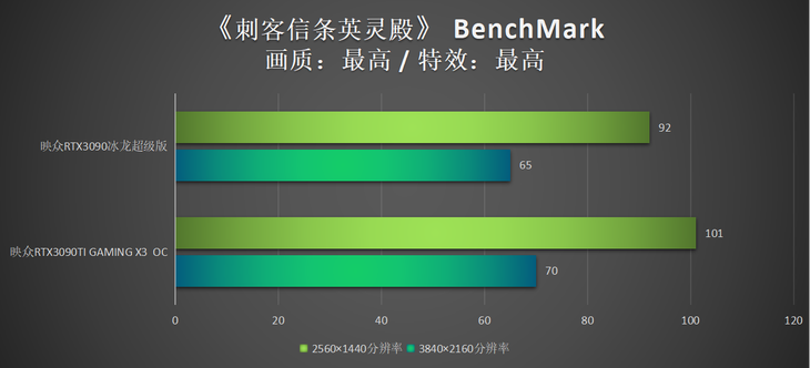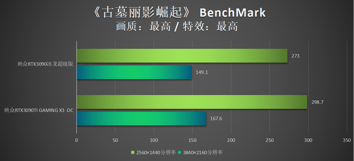 在《古墓丽影崛起》和《刺客信条英灵殿》中,采用Benchmark测试,分别测试2K与4K分别率,映众INNO3D GEFOFCE RTX 3090 Ti Gaming X3 OC版相比RTX 3090冰龙领先为12%与8%。