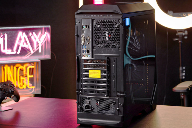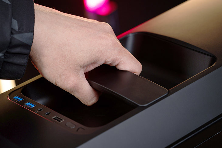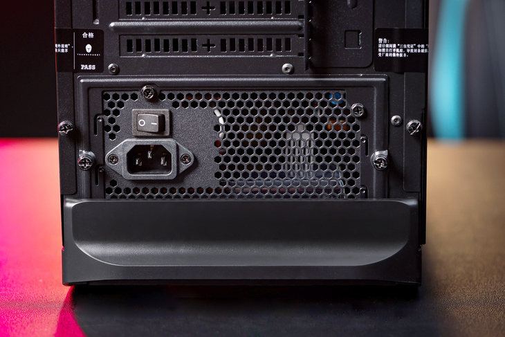 这款水冷游戏主机采用了下置电源设计。电源上设计有独立的开关键。