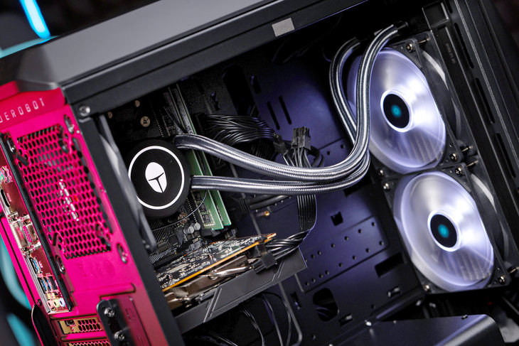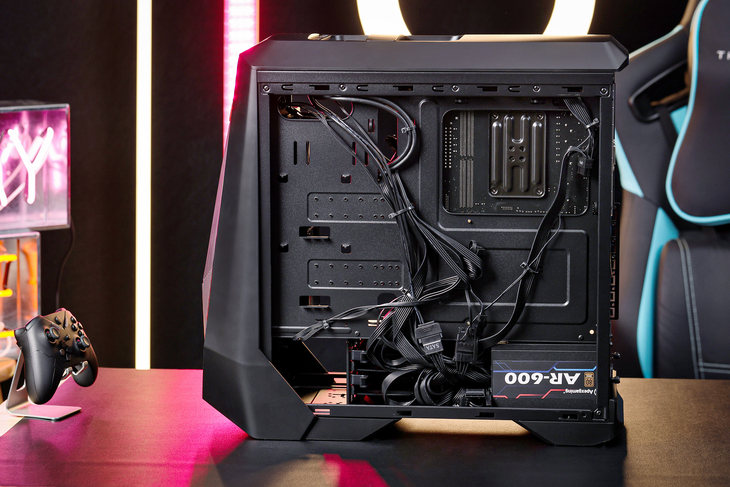 这款水冷游戏主机采用了分仓设计。电源仓和硬盘仓均是独立的。并且采用了背板走线设计,能够有效提高机箱内部的美观程度与通风散热性能。