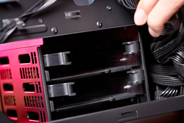 拆开另一侧机箱侧板,可以看到机械硬盘的安装位和电源的安装位。