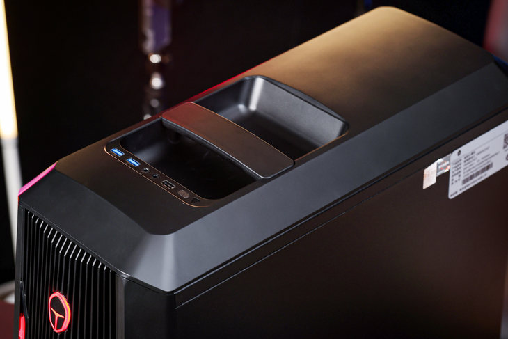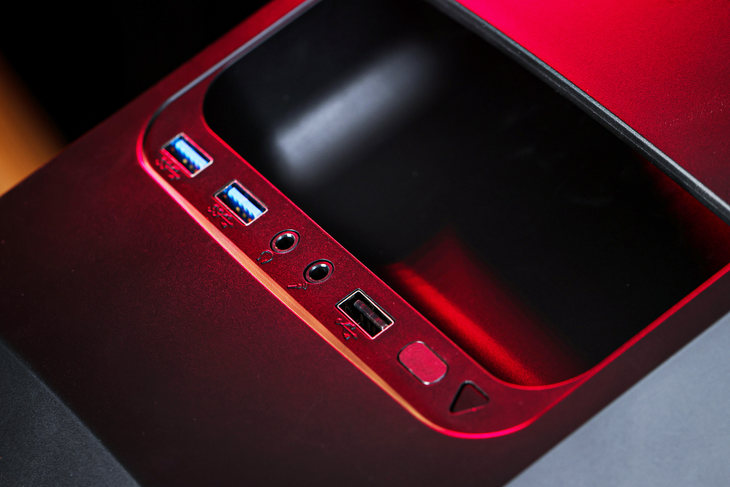 机箱顶部还设计了两个USB3.0接口、耳机接口、耳麦接口、一个USB2.0接口、一个三角形状的重启按键。