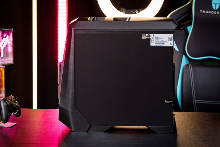 右手侧机箱盖为钢板设计,支持免工具拆卸。根据右手侧机箱盖上面的铭牌,可知这款水冷游戏主机的主要配置。