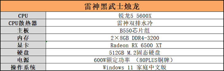 AMD 锐龙5 5600X处理器、双排CPU水冷散热器、Radeon RX 6500 XT显卡、B550芯片组主板、DDR4-3200MHz 2×8GB双通道内存、512GB固态硬盘、600W 80PLUS认证电源,这就是笔者眼下这款雷神黑武士烛龙水冷游戏主机的主要配置。
