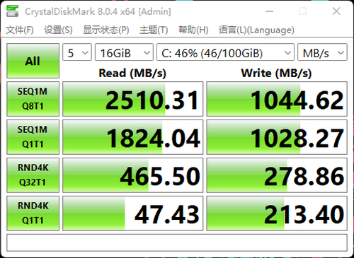 通过CrystalDiskMark这款测试软件的成绩来看,这款SSD的顺序读取速度超过2500MB/s,顺序写入速度超过1000MB/s。