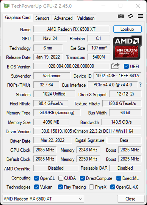 显卡搭配的是瀚铠出品的Radeon RX 6500 XT,采用单风扇散热设计,需要8pin外接辅助供电。