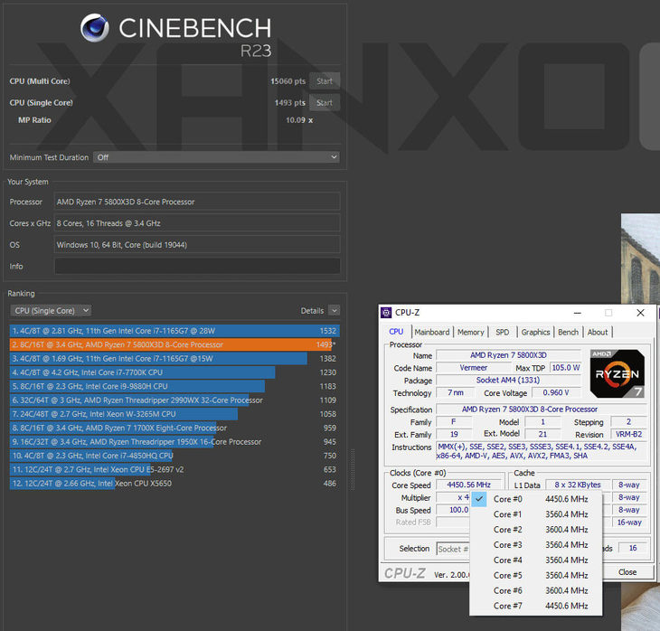 目前秘鲁网站Xanxogamging最新公布了AMD锐龙7 5800X3D处理器零售版的CineBench R23跑分成绩,单核成绩1493 pts,全核成绩15060 pts。