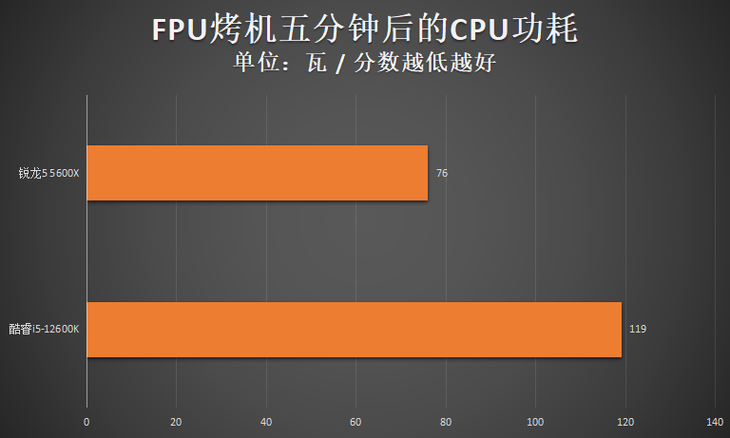 测试小结:凭借着成熟的7nm工艺制程,AMD锐龙5 5600X的满载功耗表现是要比酷睿i5-12600K低上不少的。