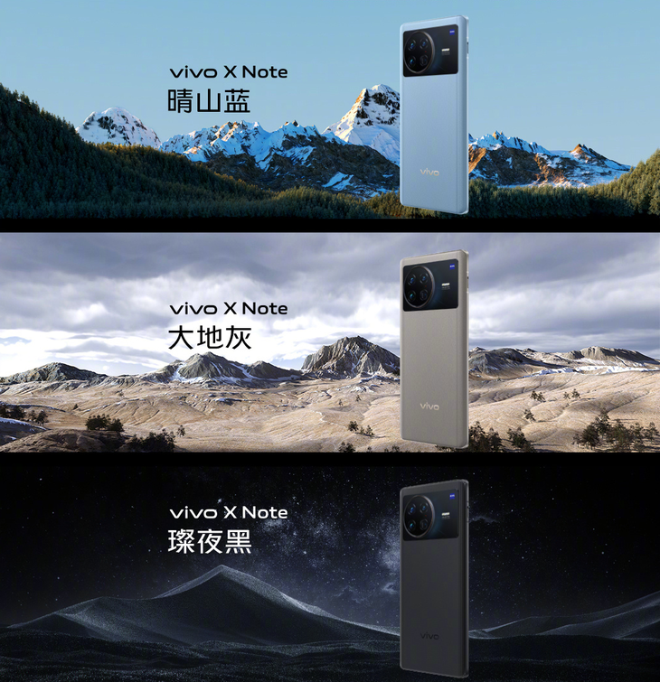外观方面,vivo X Note采用方圆天阶设计,提供晴山蓝、大地灰、璨夜黑三种配色可选,机身最薄8.37mm,重量最轻216g。