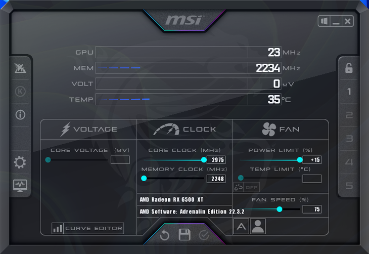 对于瀚铠这款RX 6500 XT显卡,Afterburner超频软件最大频率可以解锁到2975MHz,显卡功耗最大可以多解锁15%。为了保障显卡的散热,笔者在Afterburner里将瀚铠这款RX 6500 XT显卡的风扇转速调至了75%。