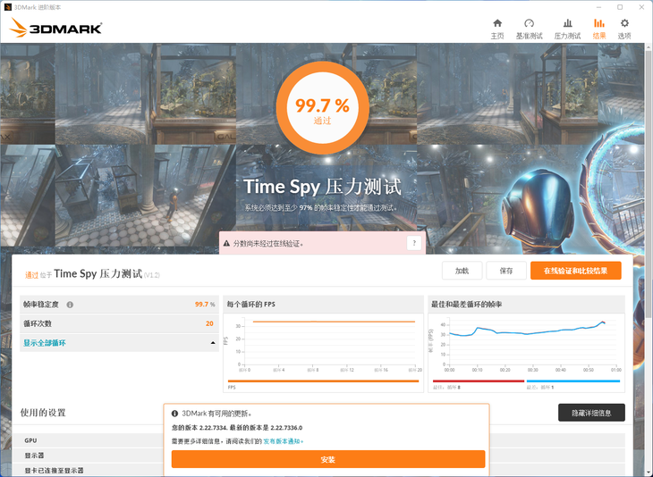 最终,在核心频率超频至2975MHz,显卡功耗多解锁15%的超频状态下,瀚铠这款RX 6500 XT显卡可以通过3DMARK的稳定性测试。