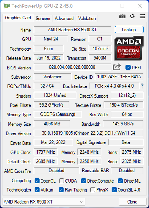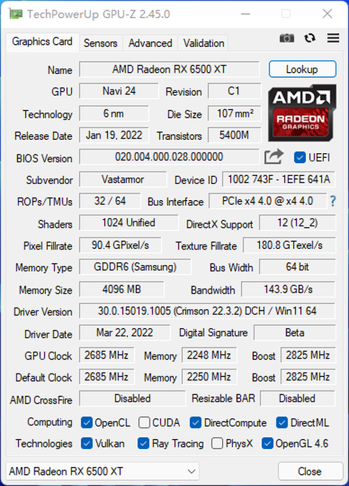 瀚铠这款RX 6500 XT显卡默认的GPU为2685MHz,Boost频率为2825MHz,显存频率为2250MHz(等效18000MHz)。