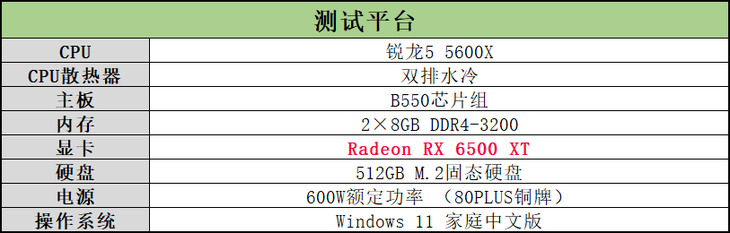 测试平台,笔者选用的是锐龙5 5600X搭配B550芯片组主板的攒机方案,配上RX 6500 XT显卡,这样一套平台目前在DIY硬件市场上很流行,性价比很高,也很具有代表性。
