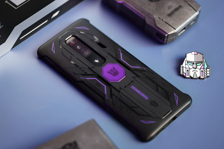 最后我们来看一下定制版本的红魔7与普通版有哪些不同之处。红魔7变形金刚霸天虎限量典藏版机身具备更强烈的机甲风格,并且采用了经典的紫色进行点缀,同时在机身背部中间的位置也加入了霸天虎的LOGO。