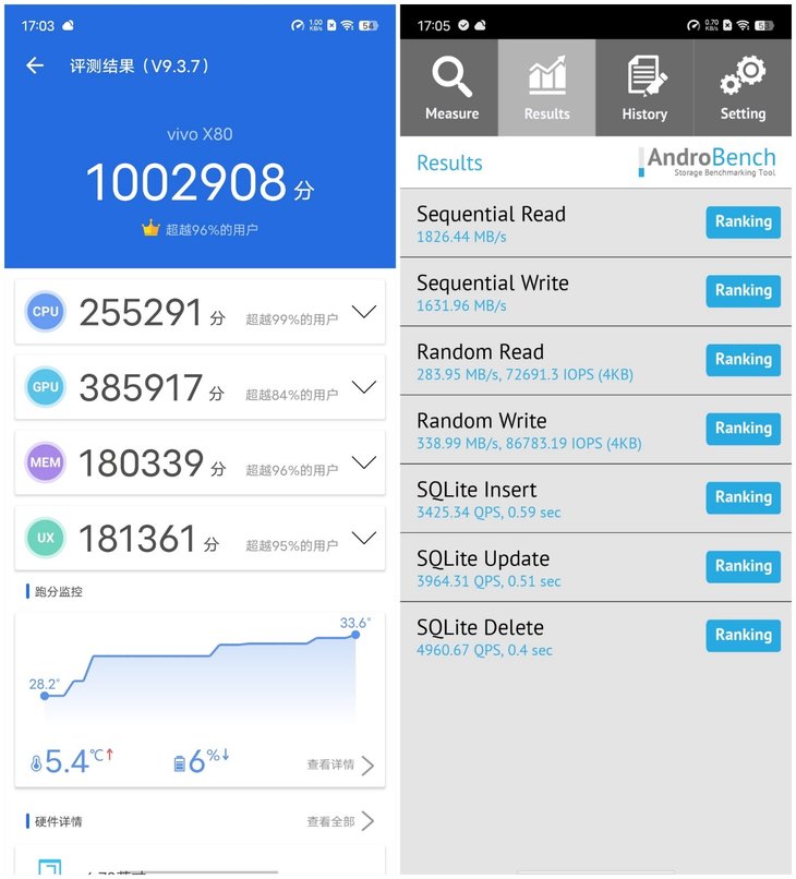 在理论跑分方面,vivo X80安兔兔综合跑分达到100万+,读写速度表现也很不错,妥妥的第一梯队水准。