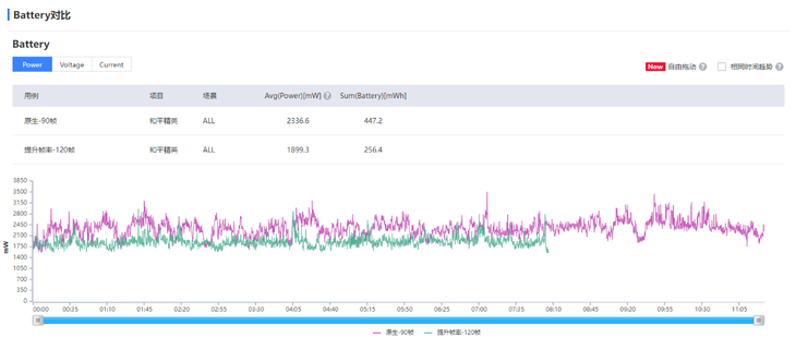 开启提升帧率模式后,原生只需渲染60帧,通过自研芯片V1+插帧到120帧,保证不错流畅度的同时,功耗甚至会降低。从上面功耗对比可以看到,《和平精英》原生90帧平均功耗为4.67W,开启提升帧率后平均功耗为3.8W,功耗有明显降低。