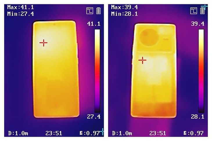 温度方面,在27度左右的环境,玩《和平精英》90帧 20分钟后,背面最高温度为41.1度,背面最高温度为39.4度,温度控制得很好,对手感影响较小。