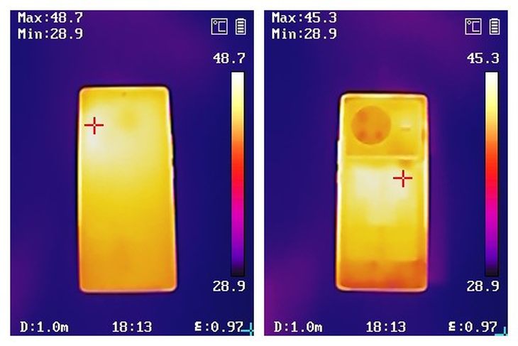 温度方面,在27度左右的环境,20分钟《原神》游戏后,正面最高温度为48.7度,背面最高温度为45.3度。虽然温度高了一些,但极限性能模式带来了相当激进的性能释放,开启其它模式会有更好的温度表现。