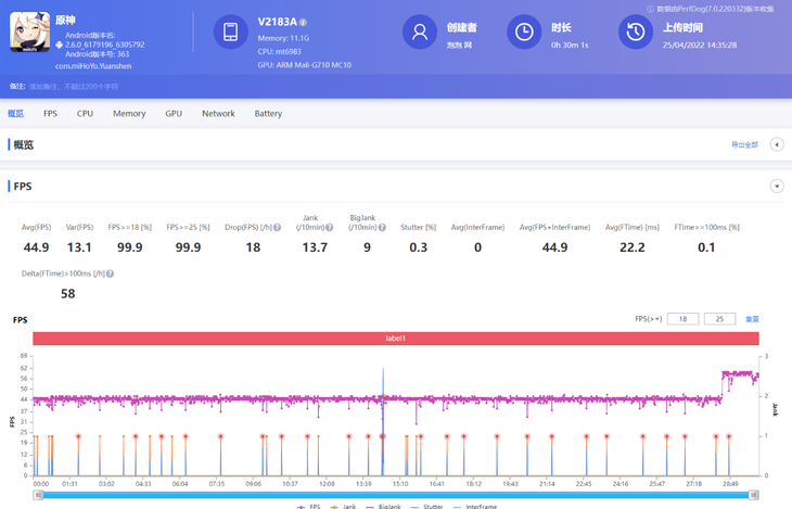 玩20分钟《原神》后,PerfDog软件记录到的平均帧数为56.6帧,这样的帧数表现是相当不错的,流畅度很好。游戏过程中,有97.4%的时间帧数都高于50帧,20分钟后也没有出现锁帧的现象。