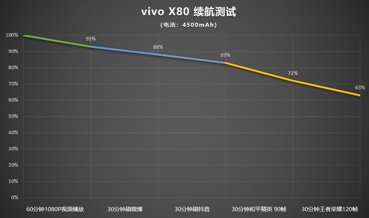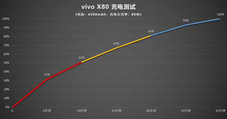 vivo X80内置4500mAh电池,支持双电芯 80W 闪充。充电方面,使用原装充电器进行充电测试,具体结果如下图。