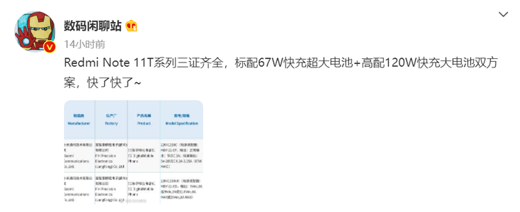 4月28日消息,据@数码闲聊站在微博爆料的信息,Redmi Note 11T系列三证齐全,将会采用标配67W快充超大电池+高配120W快充大电池双方案。