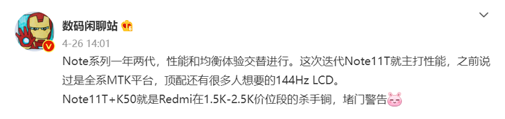 @数码闲聊站此前的爆料信息提到,Note系列一年两代,性能和均衡体验交替进行。这次迭代Note11T主打性能,全系MTK平台,顶配版本采用144Hz LCD屏幕。