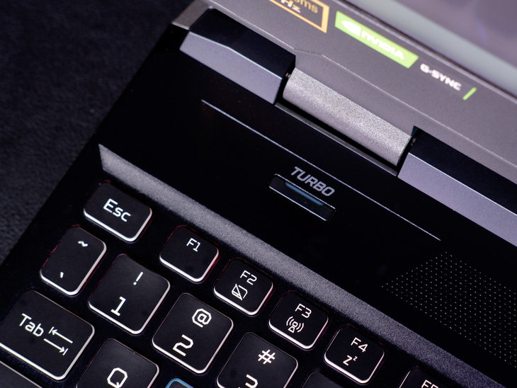 键盘面左前方设计了一枚TURBO按键。点击它即可开启TURBO运行模式,按键内建的蓝色灯效也会随之点亮。TURBO运行模式是这款游戏本的最强性能模式,该模式下散热器会全速运行。注意,想要开启TURBO运行模式,必须要接好电源供电。