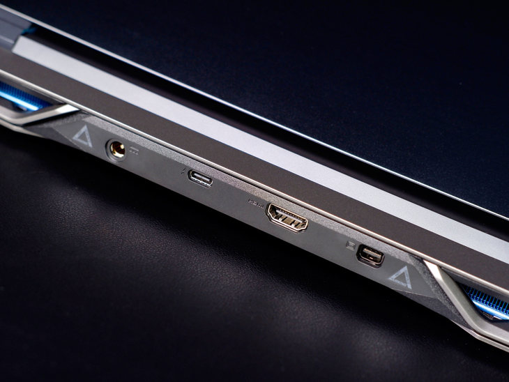 机身后部设计了电源接口、一个USB 3.2 Type-C接口、一个HDMI 2.1接口、一个迷你DP 1.4接口。