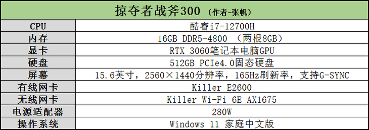 酷睿i7-12700H处理器、16GB DDR5-4800MHz内存、RTX3060笔记本电脑GPU(支持独显直连)、280W大功率电源适配器、15.6英寸2.5K专业电竞屏幕、512GB PCIe4.0固态硬盘、双Killer网卡,这就是笔者手中这款掠夺者战斧300游戏本的大致配置。