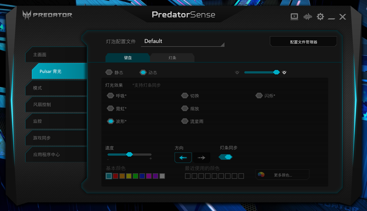 在Pulsar背光界面下,可以对RGB背光键盘和炫光RGB LED灯带进行灯效设置。