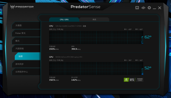 PredatorSense的主界面,可以比较直观地了解这款游戏本的运行状况。