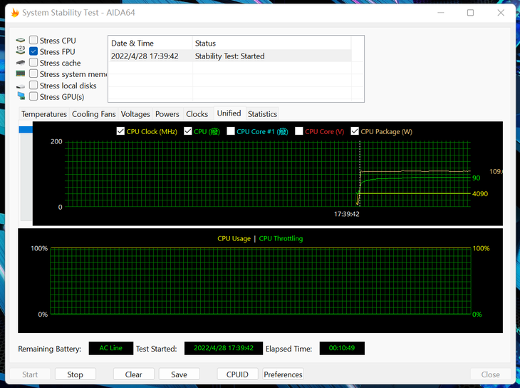 通过10分钟的FPU烤机测试来看,这款游戏本所搭载的酷睿i7-12700H处理器具备了高达109W的性能输出实力,表现很好。