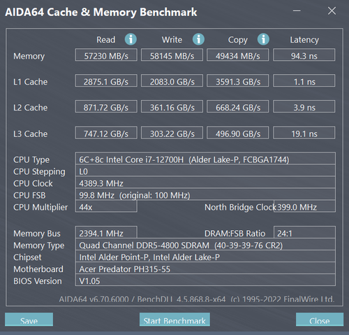 两根DDR5内存“四通道”运行模式下的性能表现,读取、写入、复制性能均不错,只是内存延迟偏高。