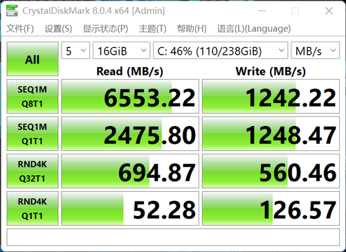 在CrystalDiskMark这款软件中,这款固态硬盘的写入成绩异常。笔者测试了多次,写入速度都在1200MB/s左右,成绩明显异常。笔者猜测有可能是电脑BIOS的问题,也有可能是Win11系统的问题。