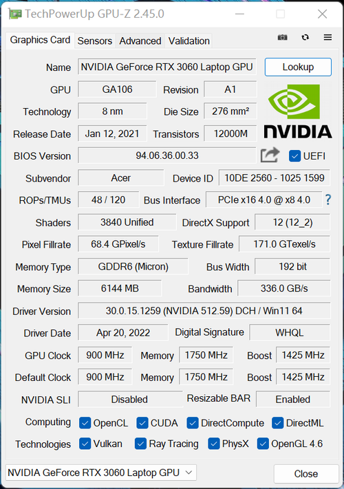 3060笔记本电脑GPU默认的GPU频率为900MHz、Boost频率为1425MHz,显存频率为1750MHz(等效14000MHz)。