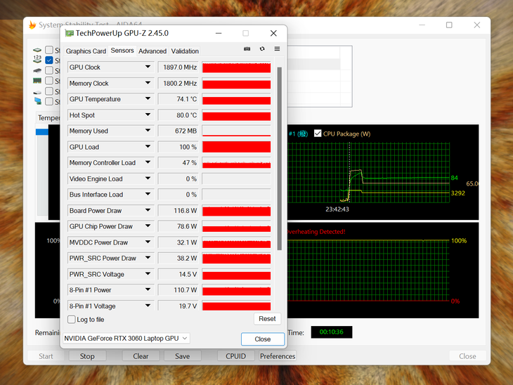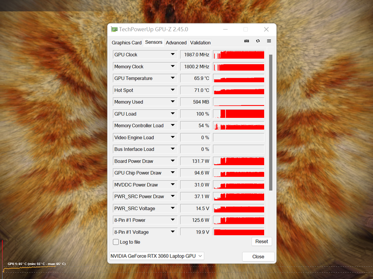 宏碁官方标称为这款游戏本的RTX 3060笔记本电脑GPU加持了高达140W的性能输出实力。但是通过FurMark烤机实测结果来看,这款游戏本的RTX 3060笔记本电脑GPU在FurMark重负载状态下,GPU的输出功耗最大只能达到132W,目前还达不到官方标称的性能水平。注,笔者是在涡轮模式以及独立直连模式下进行的测试,已尽量发挥出了这款游戏本的最强性能表现。