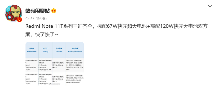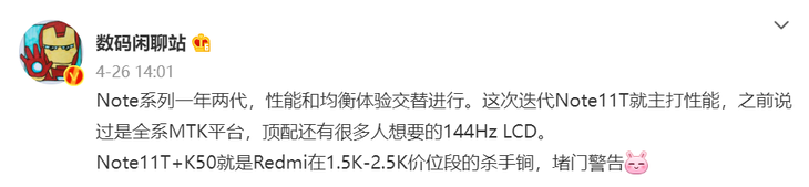 据@数码闲聊站在爆料信息,Redmi Note 11T系列将会采用标配67W快充超大电池+高配120W快充大电池双方案。这次迭代Note11T主打性能,全系MTK平台,顶配版本采用144Hz LCD屏幕。