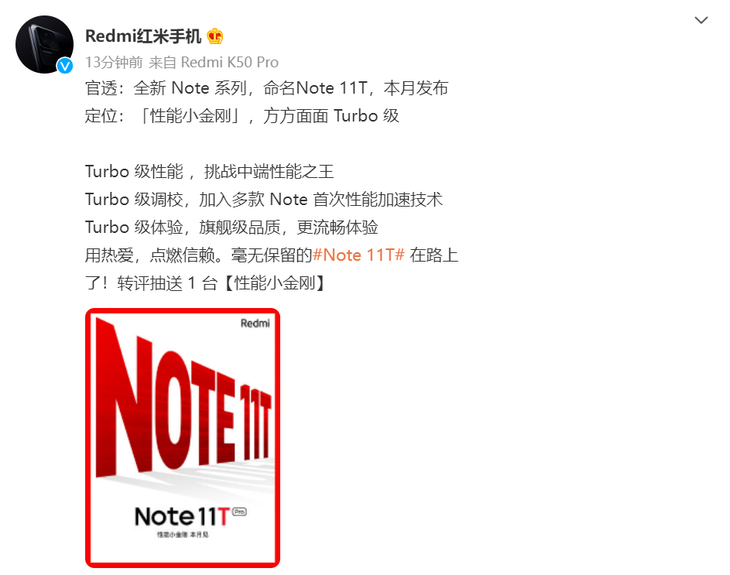 全新Redmi Note系列本月发布:命名Note 11T