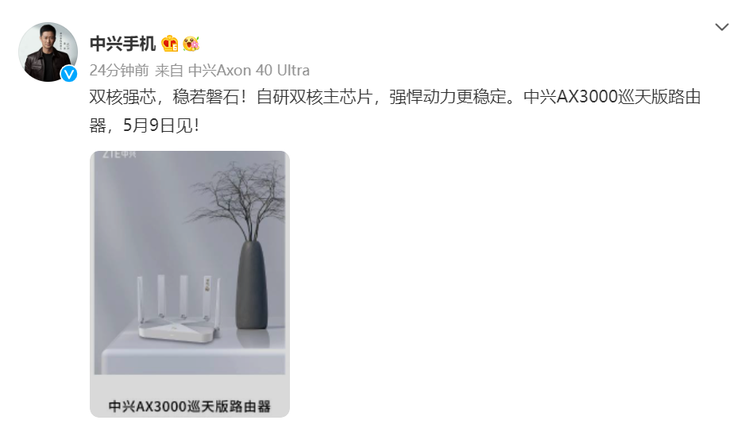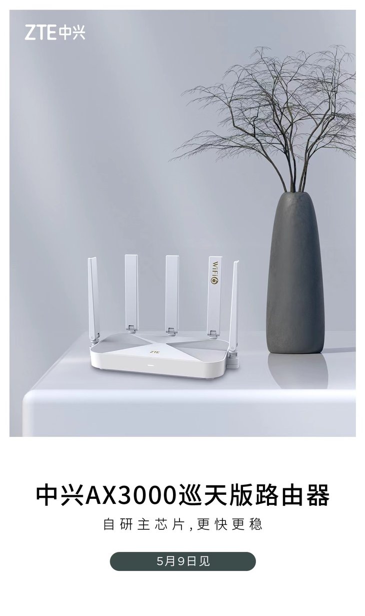 5月7日,中兴手机官微宣布,中兴AX3000巡天版路由器新品将会在5月9日发布。