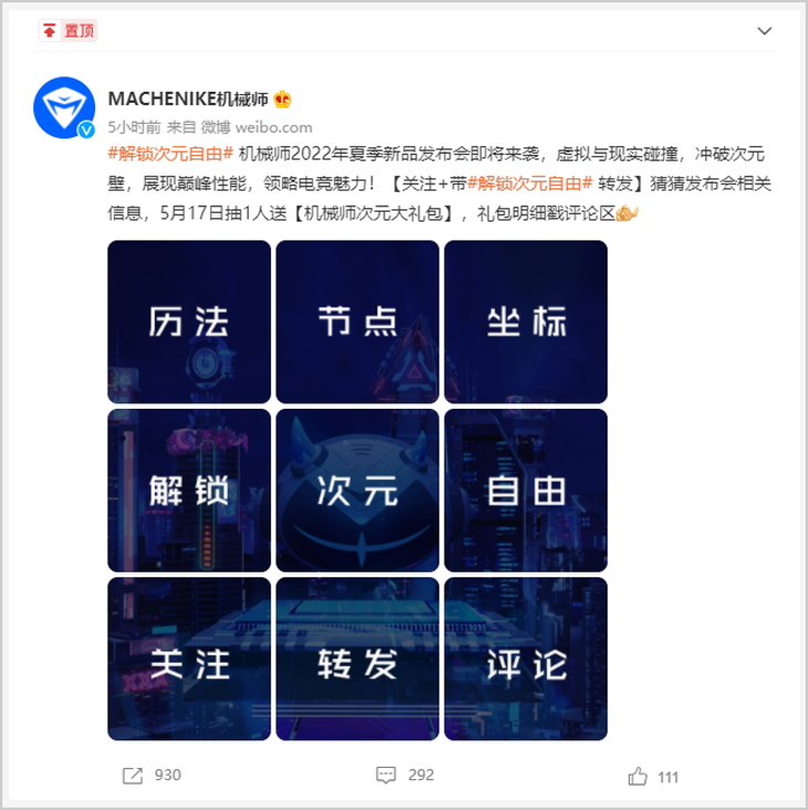 解锁次元自由!国内游戏PC制造商机械师将在这个月带来一波全新的装备,玩家们可以期待下。目前,机械师官方微博已经发布了不少关于机械师2022夏季新品发布会的预热消息,并且开启了“猜猜发布会相关信息”的活动,欢迎大家踊跃参加。