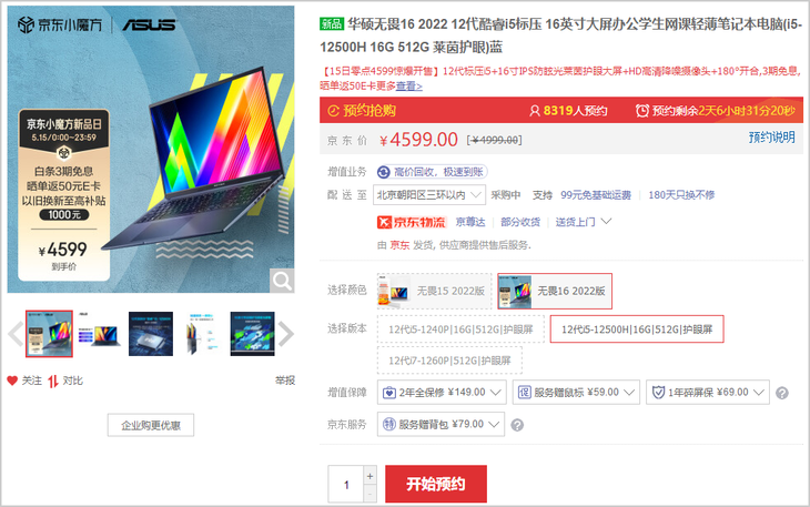 华硕无畏16 2022 12代标压轻薄本开启预售:16英寸大屏,4599元超给力