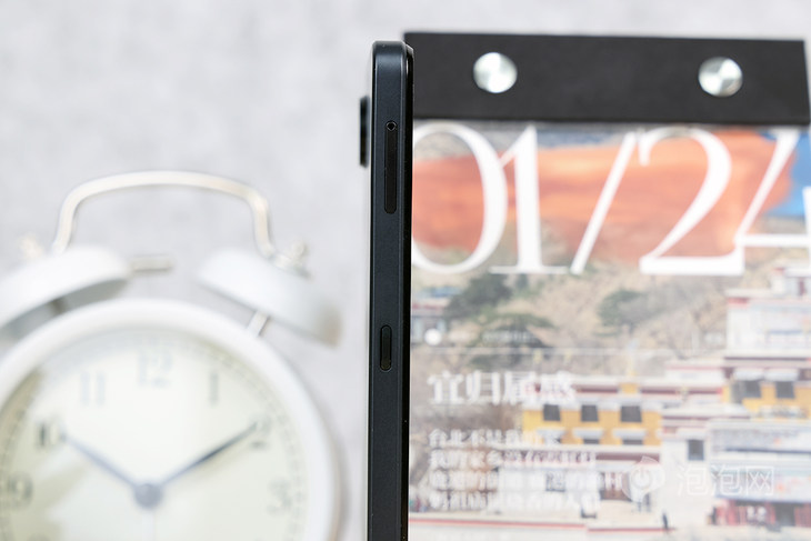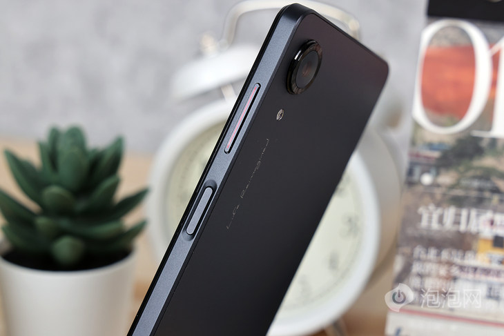 机身右侧是音量键以及开机键,在音量键上有附有暗红细线装饰,提亮了整机色彩。开机键位置采用了内凹设计,可以让手指更精准的定位按键位置。海信阅读手机A9的开机键同时也是指纹识别按键,使用起来也非常方便。