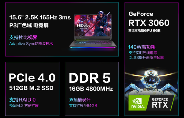 硬件方面,ROG魔霸新锐2022搭载AMD锐龙9 6900HX处理器,采用8核16线程,最高频率可以达到4.9GHz,可以实现90W的性能释放。与之搭配的NVIDIA GeForce RTX3060笔记本电脑GPU 6GB,可以实现140W满功耗输出,支持实时光线追踪以及DLSS,为游戏玩家带来流畅稳定的游戏体验。