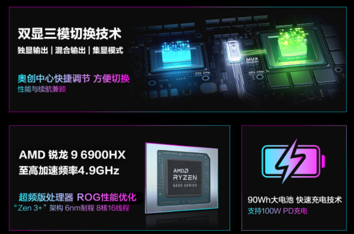 ROG魔霸新锐2022支持双显三模显卡切换,支持独显输出、混合输出、集显输出三种模式,切换更方便。