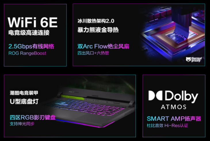 ROG魔霸新锐2022搭载16GB 4800MHz DDR5内存以及512GB PCIe 4.0 M.2 SSD硬盘,并且预留了内存以及硬盘扩展插槽,为用户后续的扩容提供了便利。此外,ROG魔霸新锐配备90Wh大电池,支持100W PD快充,支持WiFi 6E,拥有四区RGB影刃键盘,搭载冰川散热架构2.0,散热更高效。