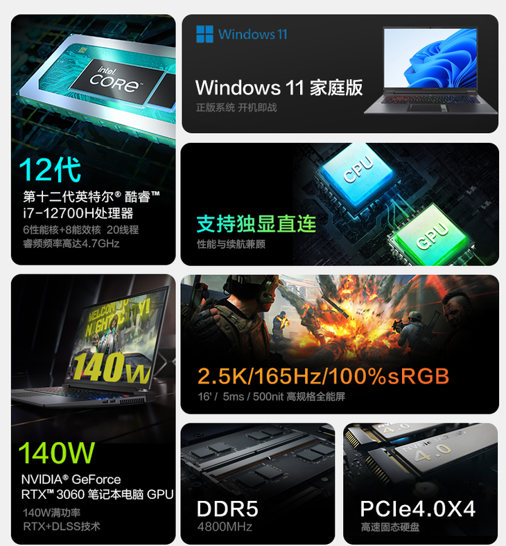 配置方面,雷神911 Zero配备了英特尔第12代i7-12700H处理器,睿频频率至高可达4.7GHz,拥有最高115W的性能释放。显卡则是采用的RTX3060笔记本电脑GPU,拥有6GB显存,可以带来140W的性能释放。雷神911 Zero也支持独显直连,可以更好的发挥显卡的性能优势。